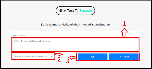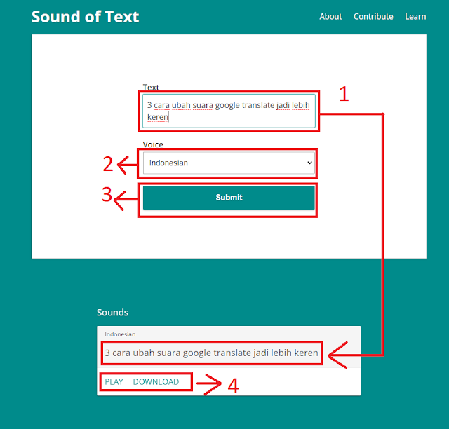 - Selanjutya perhatikan seperti tampak gambar dibawah beserta keterangannya, untuk langkah proses mengkonversi teks jadi suara google translate cewek indonesia, sebagai berikut.