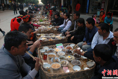 Di Luchun County, China Tepatnyad di Provinsi Yunnan China Anda akan dijamu *Hani dengan masakan tradisional dan masakan lainnya. Makannya pun bersama dengan penduduk sekitar, dan bukan itu saja para wisatawan, pejalan kaki dan yang menghampiri jalan tersebut akan ikut berkumpul menyantap makanan yang sudah disajikan.